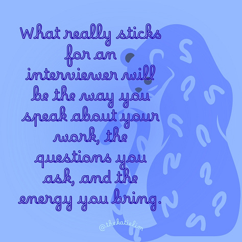 What really sticks for an interviewer will be the way you speak about your work, the questions you ask, and the energy you bring.
