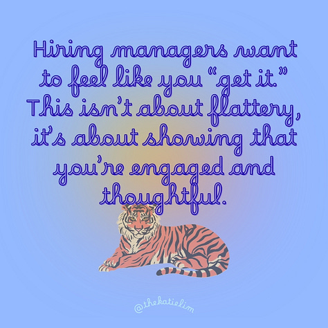 Hiring managers want to feel like you “get it.” This isn’t about flattery, it’s about showing that you’re engaged and thoughtful.